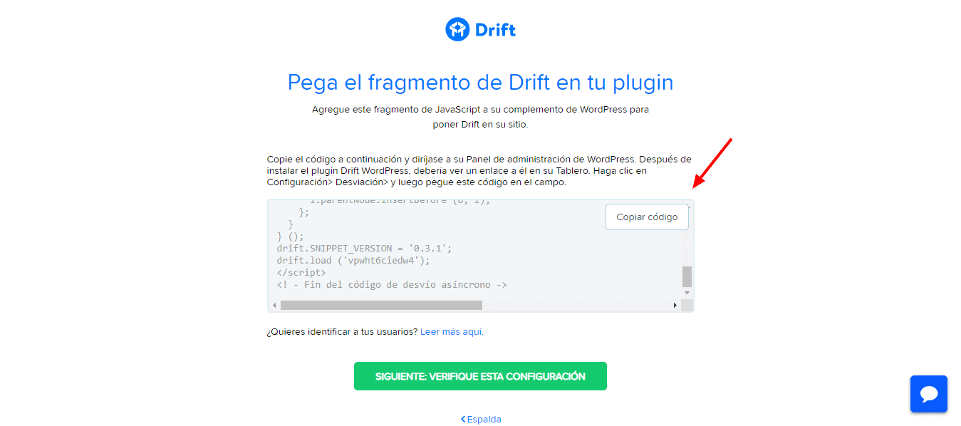 Seguidamente Drift nos pide que copiemos un código Java Script y lo peguemos dentro de la configuración, en el plugin que nos descargamos.