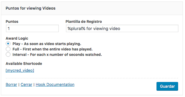 Para hacerlo tenemos que activar el hook «Puntos for viewing Videos»